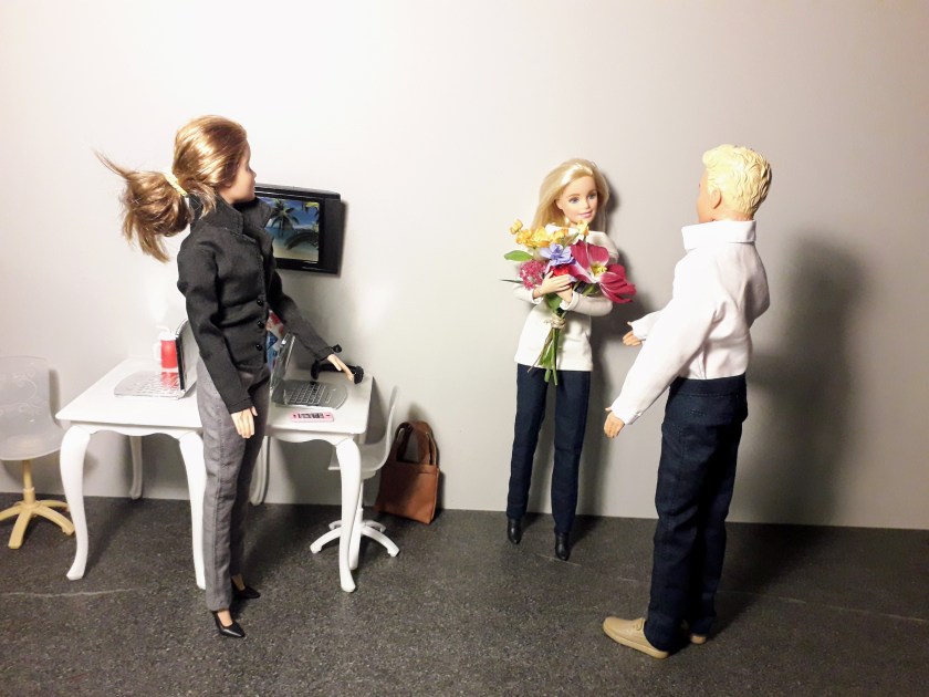 Lathyrus neemt de felicitaties en de bloemen in ontvangst en is helemaal blai met deze leuke verrassing! De HRM-dame neemt een foto, maar het is daarvoor eigenlijk nog te vroeg in die ochtend vindt Lathyrus. Haar geziecht is nog niet helemaal wakker zeg maar… Andere collega’s van de afdeling komen haar ook feliciteren en Lathyrus vindt het allemaal heel gezellig en bijzonder! Maar de vreugde kan niet te lang doeren, want er moet nog veel werk verzet worden vandaag.