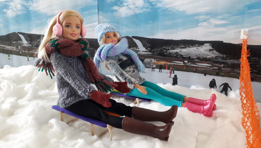 Bovenaan moet je wel even wachten op het juiste moment om keihard met je slee naar beneden te gaan. Het is stiekem toch een beetje druk op de piste en er zit geen stuur op de slee. Je kunt met je voeten in de sneeuw een beetje afremmen, maar uitwijken naar links of rechts wordt lastig. In volle vaart roetsjen ze al gillend van de pret naar beneden. Onderaan de piste is een oranje vangnet. De slee blijft steken in een of ander richeltje en Lathyrus en Lygulariah worden beide in het vangnet gelanceerd. Wat een pret!