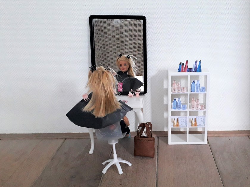 De kapster pakt een grote spiegel en houdt deze achter Lathyrus, zodat ze haar geknipte haar kan zien. “Wat vind je er zo van?” vraagt de kapster verwachtingsvol. “Eh… het ies denk iek goed geknipt, maar ga je het ook nog föhnen enzo? Want zo ziet het er niet oit. Iek kan zo echt niet over straat” zegt Lathyrus. “Ja, natuurlijk” zegt de kapster, “ik wou alleen maar even laten zien hoeveel er af is gegaan”.