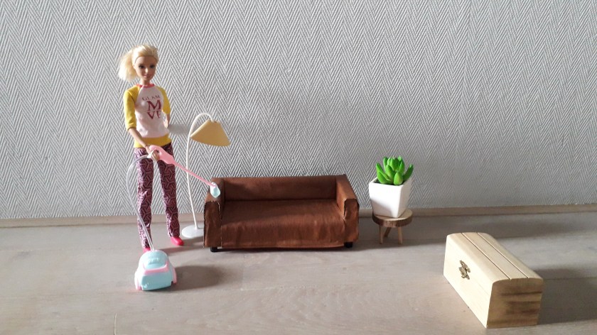 Ze haalt de plant van het krukje, houdt de stofzoiger met haar linkerhand vast, de stofzoigerslang met haar rechterhand en stapt op het krukje. Ja, zo kan zai er precies bai!